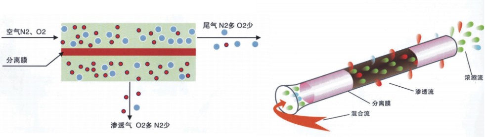 膜分離制氮機技術(shù)是根據(jù)空氣中的氮氣和氧氣在膜兩側(cè)壓差作用下,在膜中的溶解度和擴散系數(shù)不同而實現(xiàn)分離的,滲透率快的水蒸汽、氧氣等一些氣體先透過膜,成為富氧氣體,而滲透率較慢的氮氣則滯留富集,成為干燥的富氮氣體,達到氧氮分離的目的。